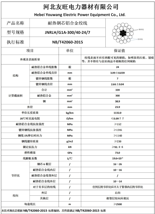 四、耐热钢芯铝合金导线NRHLGJ300/40厂家直销产品基本参数及样本图片:如下图表