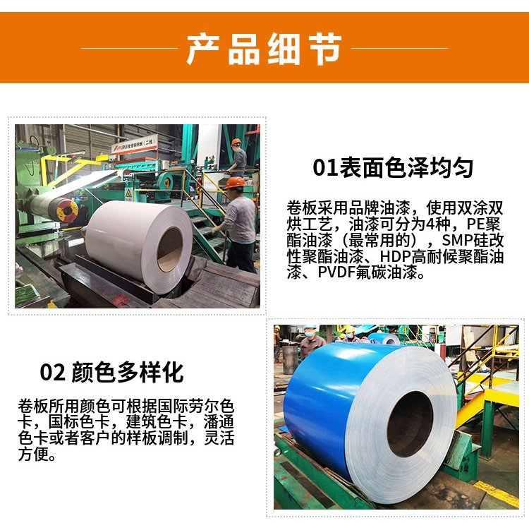 ? ? ? ?彩涂卷所用涂料根据使用环境不同选择合适的树脂,如聚酯硅改性聚酯、聚氯乙烯塑料溶胶等。用户可根据用途进行选择。