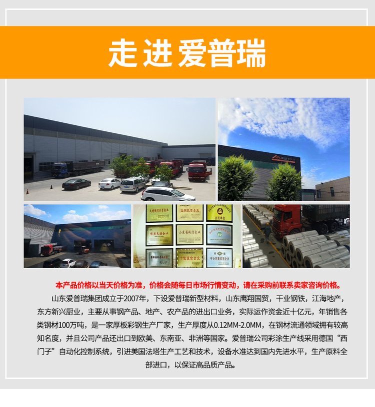 ? ? ? ?山东爱普瑞钢板可生产0.12mm-2.0mm 厚度,600mm-1500mm宽度的彩涂钢板,彩涂钢板生产过程对环境危害较小,而且可以回收利用,大大减轻了对环境的污染,而且自重较轻,可以节省承重结构用料,降低造价。彩涂板可根据需要辊压成各种形状、长度的压型钢板,中间一般无搭接,加工方便,便于施工,防水效果好。