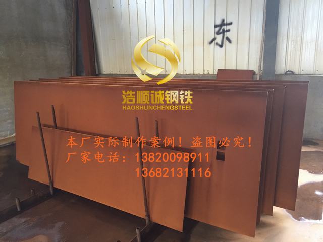 再次普通民众对耐候钢板比较陌生,当他们面对这两个难题时,往往没有办法解决,容易联想到用普通钢板制作的劣质工程,以次充好,通过跟甲方、承包方打关系希望笼统过关。但带来的后果是普通钢板一到两个月内形成疏松容易脱落的锈层,一块一块的脱落,大大影响设计效果,打击了建筑方的良好设计,形成影响工期、影响房销售、影响施工方收工程款等一连锁问题!