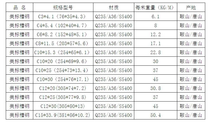 美标槽钢是截面为凹槽形的长条钢材,属建造用和机械用碳素结构钢,是复杂断面的型钢钢材,其断面形状为凹槽形。美标槽钢主要用于建筑结构、幕墙工程、机械设备和车辆制造等。 槽钢的主要产地是唐钢、包钢、山钢、黄特、马钢、宣钢、日钢等几家钢厂。