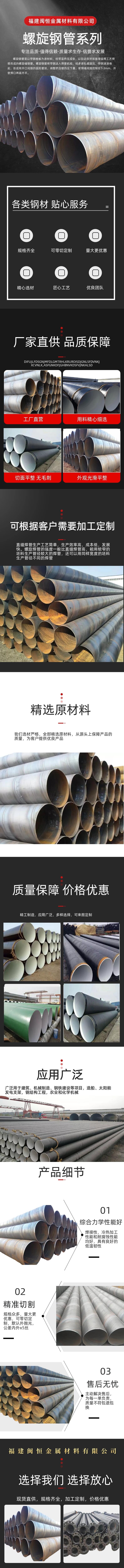 福建闽恒金属材料有限公司是一家生产双面埋弧焊螺旋钢管的厂家,本厂生产螺旋钢管,T字焊钢管,钢护筒,大型机制卷管。同时承接焊接钢环,加强筋,管道配件制作等业务;可根据用户的要求,定做各种规格型号长度的异型号钢管,也可带料来厂加工生产;另外加工钢管内外防腐制作:环氧煤沥青三油两布,水泥砂浆等各种防腐