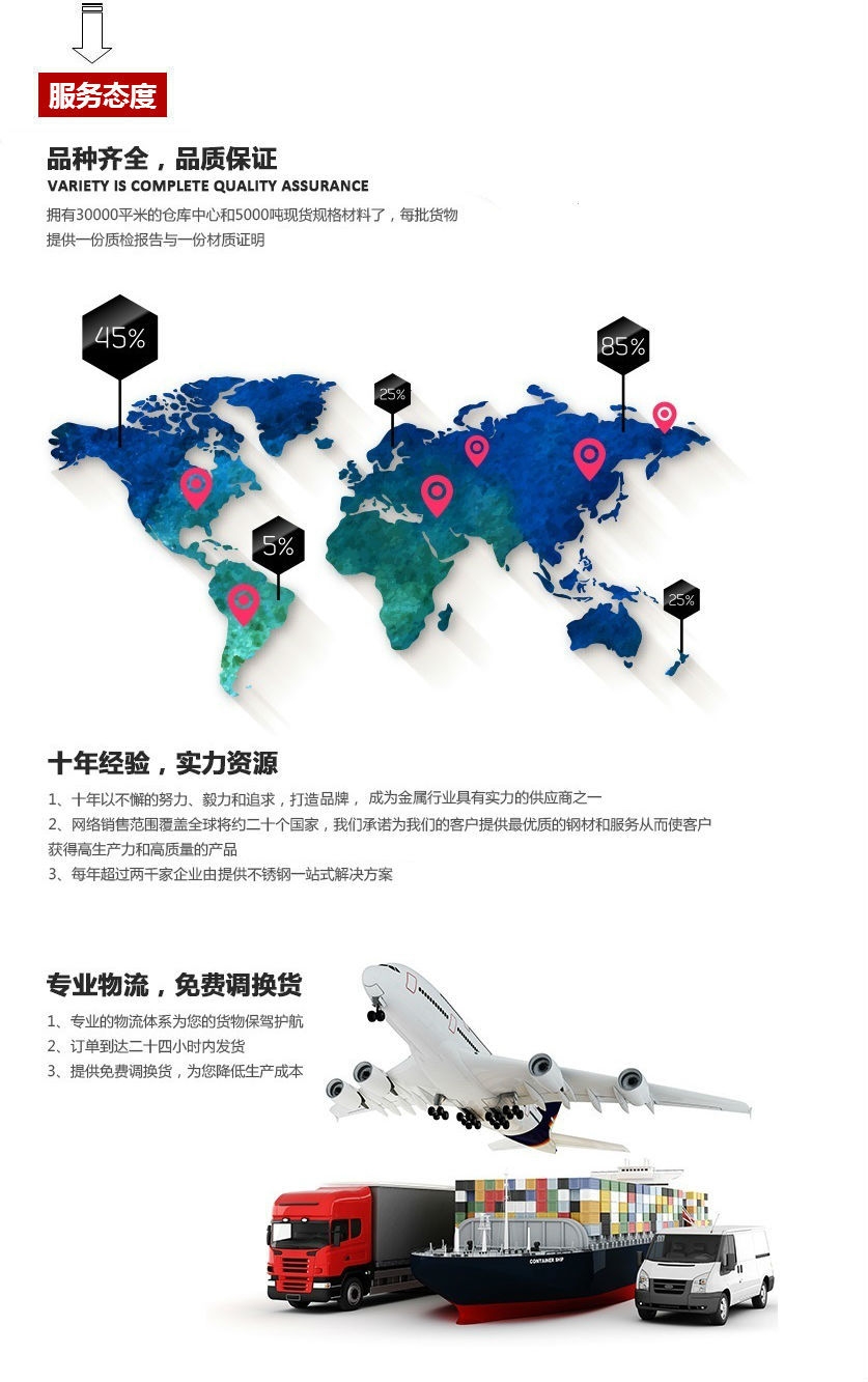 公司自成立以来始终秉承“服务,合作共赢”的理念,服务于广大新老客户。经过腾重人不懈的努力,公司发展迅速,客户遍布20多个省市地区,先后参与了国内大型工程等众多的重点工程配套的供应。公司常年库存各类产品千万号,品种繁多、规格齐全,是一家专业化的进口、国产钢材的供应商。 企业综合实力雄厚,配套设施齐全,提供各种钢铁材料开平削减其他服务。努力创建的性能,配合的态度来寻求真诚合作,双赢共生及相关业务机会更广泛,公司愿国内外朋友真诚合作,共同发展。公司经营产品应用广泛,价格合理,质量保证,与沪宁钢机、宝冶集团、徐工集团等众多知名企业均建立了长期的业务往来,建立了物流、剪切加工等一系列延伸服务,不断的完善管理,力求“共同发展,合作共赢”,以“全员参与,追求零缺,让顾客满意!”为立足点,成为了国内钢铁行业销售商的佼佼者!企业,品质保证,值得信赖的企业。