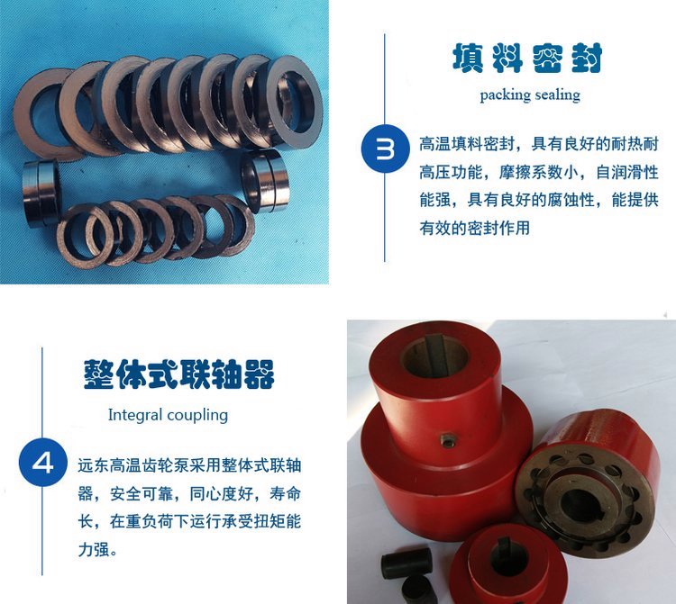 高温齿轮泵靠输送的液体自动润滑日常工作时,无需另加润滑油和用弹性联轴器传递动力可补偿因安装时所引起的微小偏差,在受液压冲击时起到良好的缓冲作用。