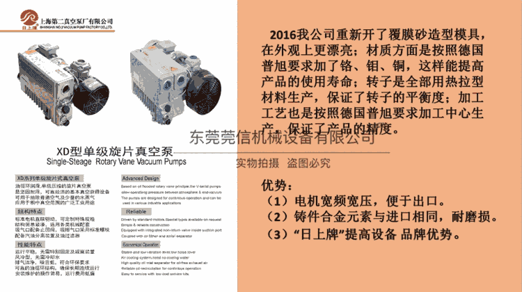 上海第二真空泵厂有限公司是一家具有几十年专业制造真空获得设备的企业,“日上牌”是公司的注册商标。其中XD系列单级旋片泵在国内外市场享有盛誉。曾荣获上海市出口产品优质奖,成为广大客商的首选产品。