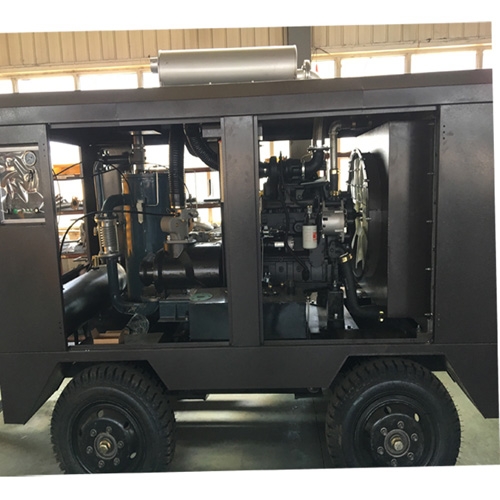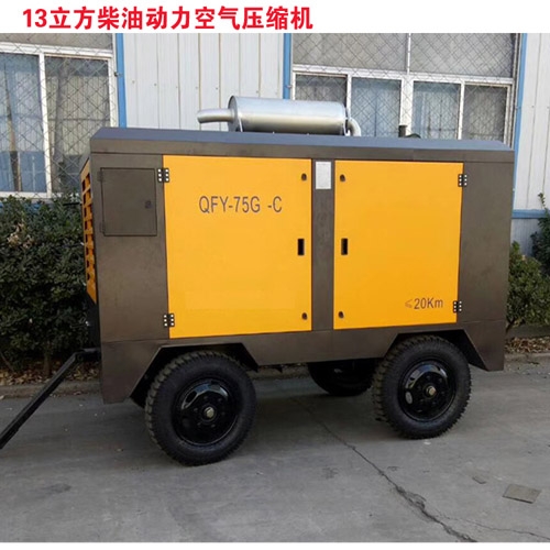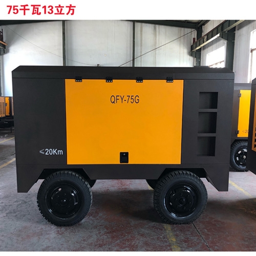 户外建筑工地大型支护喷锚用螺杆式空压机生产厂家,干喷推荐型号QFY-75G,功率75kw,排气量13立方,工作压力8公斤,空压机本身自带缓冲罐,四轮移动式带牵引,两个出气口,使用方便,喷浆机配套基坑支护、喷锚用空压机。
