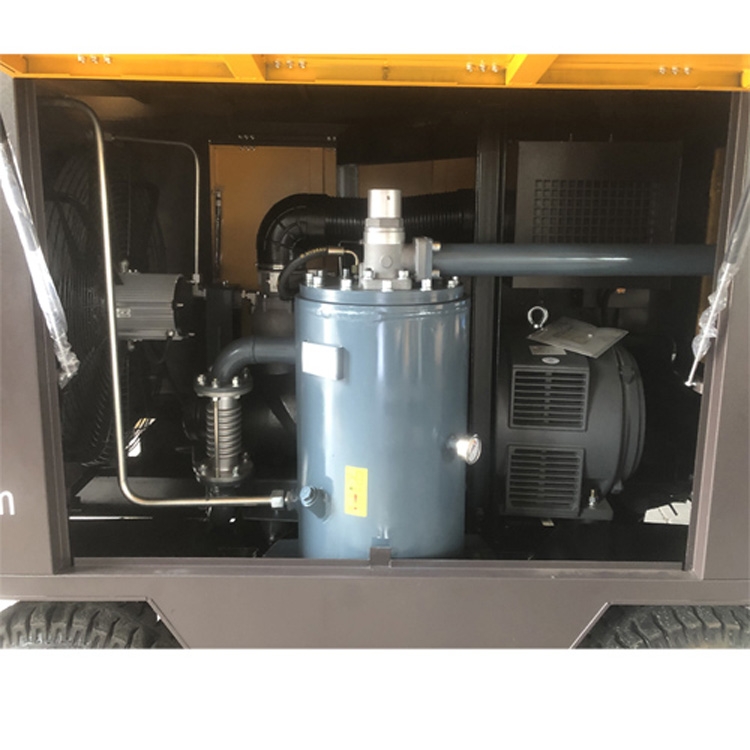 型号:QFY-75G,驱动方式:直联,电机功率:75千瓦,排气量:13立方每分钟,工作压力:8-13公斤,外形尺寸:2850*1460*1870,重量:1800公斤,四轮移动带牵引,内部自带缓冲罐,隧道矿山潜孔钻凿岩机、喷浆护坡用螺杆空压机。