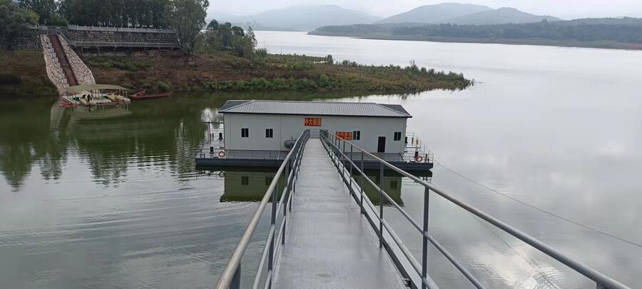 摇臂式取水泵船 ●产品用途 摇臂式取水泵船主要适用于江河湖泊及水库边建设大型取水工程,如电力、水利、化工、自来水厂等项目的大型取水工程。高水位与低水位落差≤40m,枯水季节和洪水季节水位落差大,水位涨落较快。由于岸坡较平且水深较小,而中段坡陡水深较大。可在平缓的岸坡上造栈桥,桥架延伸至水位深处,在水位深处采用摇臂式取水泵船取水;在岸坡较陡且水深达到取水要求的江河湖泊及水库边建造大型取水设施时,可直接在岸端建造支墩,采用摇臂式泵船取水。 ●结构组成及工作原理 摇臂式取水泵船主要包括泵船船体、水泵、舱内吊车(检修时使用)、进水管、出水管、真空系统、阀门、橡胶软接头、摇臂装置、船岸联络管、配电系统、自动控制系统、消防系统、栈桥等组成部分。趸船在水位变化时,能连续供水,无需更换接头。 摇臂式取水泵船采用PLC全自动控制和手动控制,电压380V、6KV、10KV均可,水泵启停操作简单,运行安全可靠。 ●主要特点 a. 适用于江河湖泊及水库边的大型取水工程,水位涨落变化时,泵船随着涨落,水泵吸水口位置始终保持不变,水泵运行不受吸程高度影响。 b. 采用PLC全自动控制系统,操作简单。 c. 与土建泵房相比:无需围堰施工,工程进度快,工期缩短,造价降低,且施工安全简单,对环境影响小。 d. 联络输水钢管上支架栈桥,工作人员科自由进出泵船。 e. 泵船船体设计平衡,船舱内设有行吊,大型设备的安装和维修可就地解决,十分方便。 f. 联络管采用万向摇臂接头联接,船体在整个水位涨落和风浪引起的升降颠摆过程中能连续取水,无需更换接头,摇臂接头受理均衡,转动灵活、密封可靠,检修方便。 g. 泵船设备安装形式上可分为上承式布置和下承式布置,取水量较大时,建议采用下承式布置。 ●泵船类型 具备通航条件时,可采用整体式船体,泵船整体制造完毕后通过水运至施工现场整体安装。