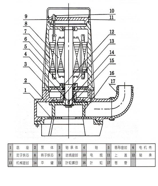 潜水电机与水泵一体,泵与电机共轴,立式安装;