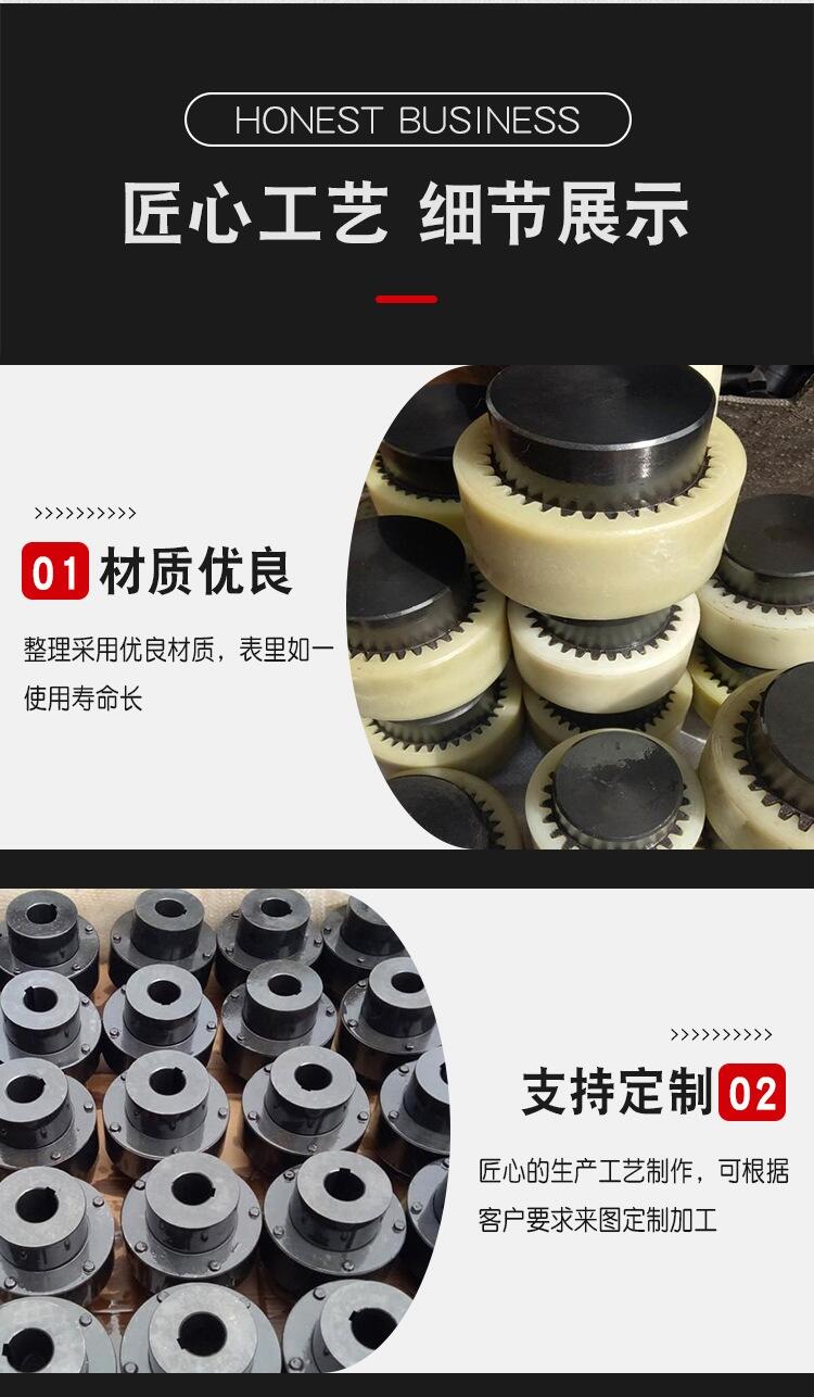 齿式联轴器是由齿数相同的内齿圈和带外齿的凸缘半联轴器等零件组成。外齿分为直齿和鼓形齿两种齿形,所谓鼓形齿即为将外齿制成球面,球面中心在齿轮轴线上,齿侧间隙较一般齿轮大。
