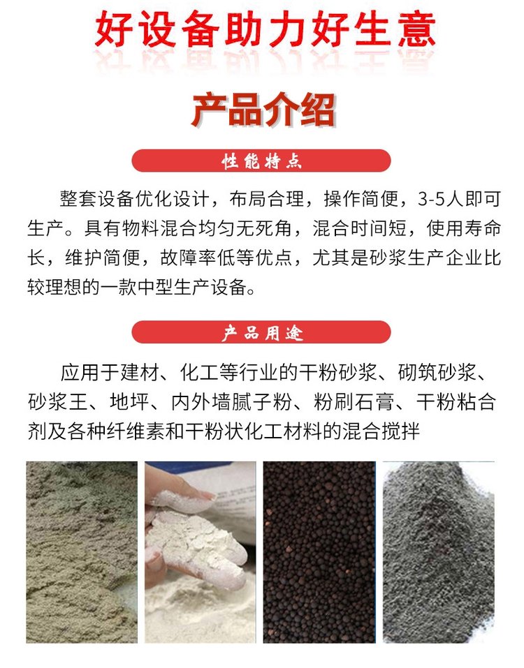可生产产品类型 | 腻子粉、普通砂浆、石膏砂浆、瓷砖胶、砂浆王等 | ||