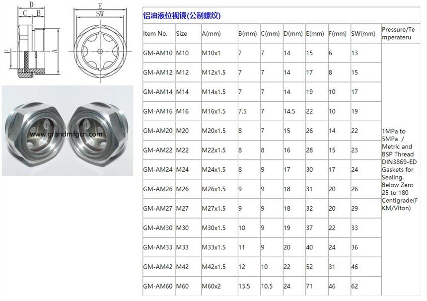 计量泵高品质铝油视镜 油窗 油位镜M12X1.5 M12x1.25