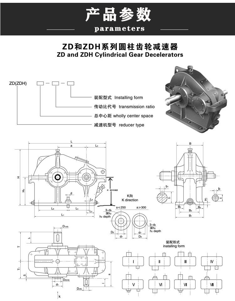中心距(a):输入轴与输出轴中心之间的距离(单位:mm),是决定减速机尺寸和承载能力的关键参数。例如 ZD50,中心距就是50mm。