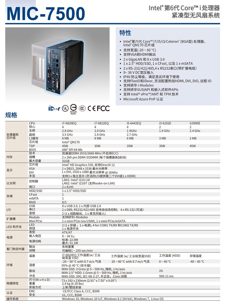 型号 | MIC-7500B-19A1E/U4A1E/S9A1E/U8 |