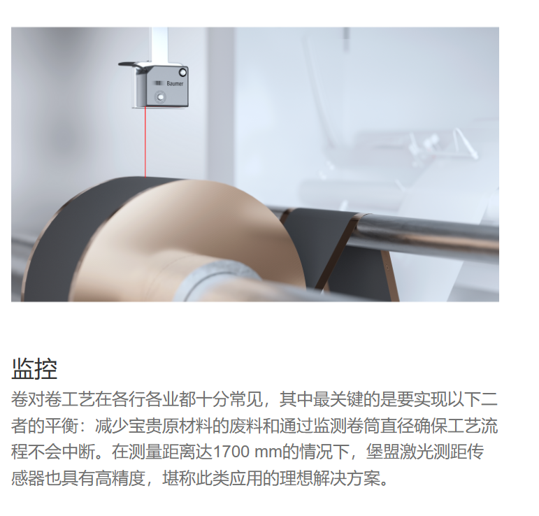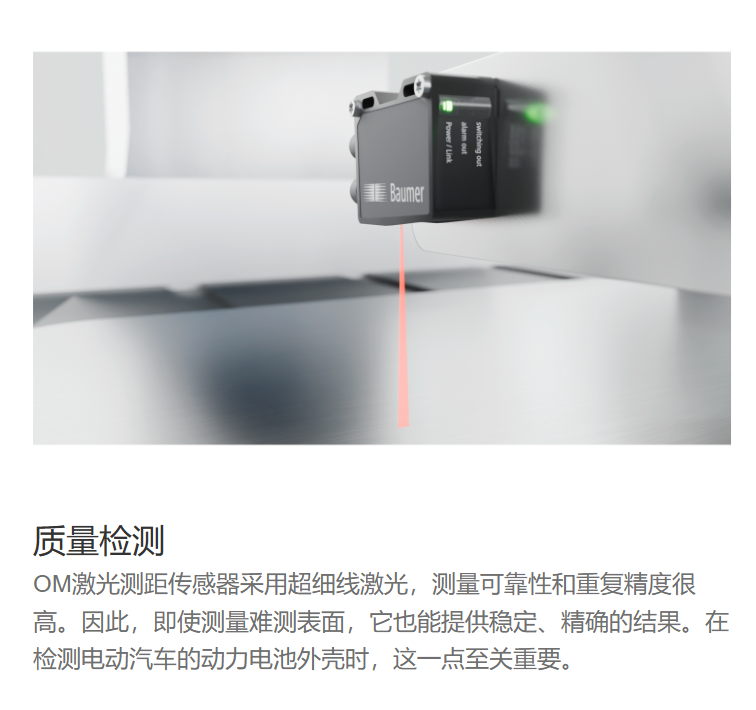 激光测距传感器的主要亮点:1、精确紧凑——树立高标准,测量性能出色,线性误差<±3 μm,重复精度高达0.12 μmOM20传感器系列外形小巧采用创新的光学元件设计和线光斑,具备曝光时间自动调节功能,测量性能不受物体表面影响测量频率高达5 kHz。2、使用方便:轻松使用OM系列的所有功能——通过参数设置优化性借助堡盟传感器套件软件或集成的Web界面,可通过直观的图形化用户界面进行参数设置,使用非常方便。3、易于连接:多种标准协议和现场总线可选:IO-Link、Modbus RTU、PROFINET、EtherNet/IP、OPC UA、Modbus TCP和UDP数据流通过过程接口进行全面的参数设置,简化生产线上混批产品的处理通过程接口从传感器获取曝光储备等辅助数据,支持状态和过程监控。