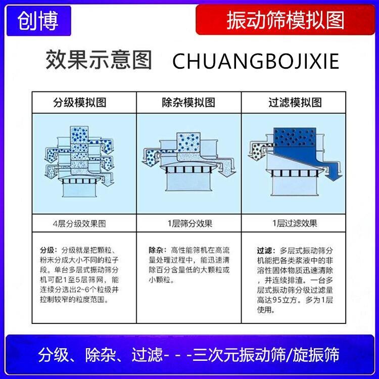 三次元振动筛优点:1、换网方便快捷,只需3到5分钟,箱体采用全封闭构造,还有快速束环设计,是一种高精度细分筛分机械。2、电机动力方面采用的是中法兰电机,动力大使水平,垂直,倾斜的三次元动力更加突出,大动力的同时噪音还低。3、筛分物料范围广,无论物料的干与湿,精细与粗糙,重与轻,只要在0-400目范围内均可筛分,即使物料是液体的或浆状的只要在600目以内也轻松筛分。4、配备有专业清网装置,在筛分物料的过程中基本不会产生堵网现象,极大的提高了筛机的筛分产量和筛分效率。5、针对不同行业的特殊需求,三次元振动筛分机还进行了独特设计,例如加缘式、闸门式、型、密封型等不同类型。