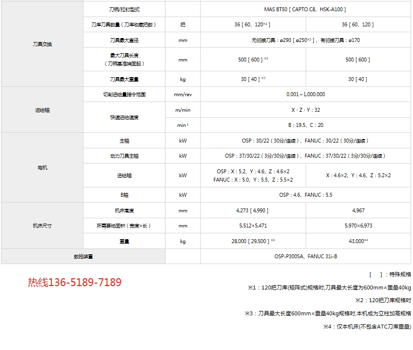 机床重量(仅限主机) | kg | 48,000~116,000 | 36,000~120,900 | 32,000~101,000 | |