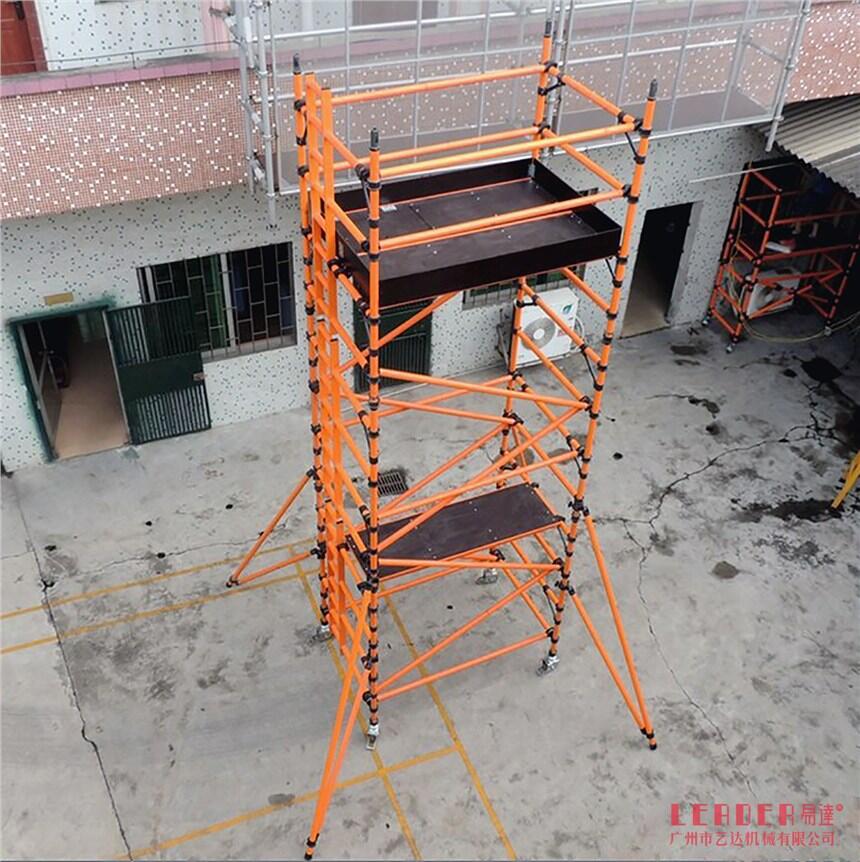 易达(LEADER)移动式玻璃纤维绝缘工作架带电作业材质采用由玻璃纤维、玻璃防护垫、无碱纤维、环氧树脂、酚醛树脂、不饱和树脂等三十多种化工材料经高温聚合、拉挤而成的矩形中空结构型材结合销棒工艺制作而成。梯梁型材符合力学结构原理,抗弯性强,不易扭曲变形;梯撑为梯形型材,接触面采用条纹形防滑设计,梯梁、梯撑为半穿透式连接,绝缘脚手架带电作业采用整根实心圆形玻璃钢棒通体穿连加固,受力均匀合理,整体连接可靠稳固。梯形根据力学原理,采用上窄下宽的八字结构整体梯形(也可根据用户要求定制上下通宽型),美观大方,稳固耐用。