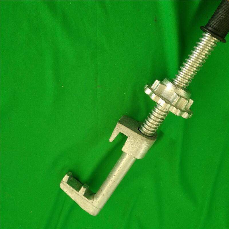 b:勾型扳手外锁式,用手将手轮旋到手把处,卡轨块移到手轮处,钩锁器钩头从钢轨外底部穿过,钩头钩住尖轨轨底,把卡轨块推到钢轨处,用手转动手轮到卡轨块,用钩型扳手扭紧,对准锁孔上锁即可,拆除反方向才做即可。