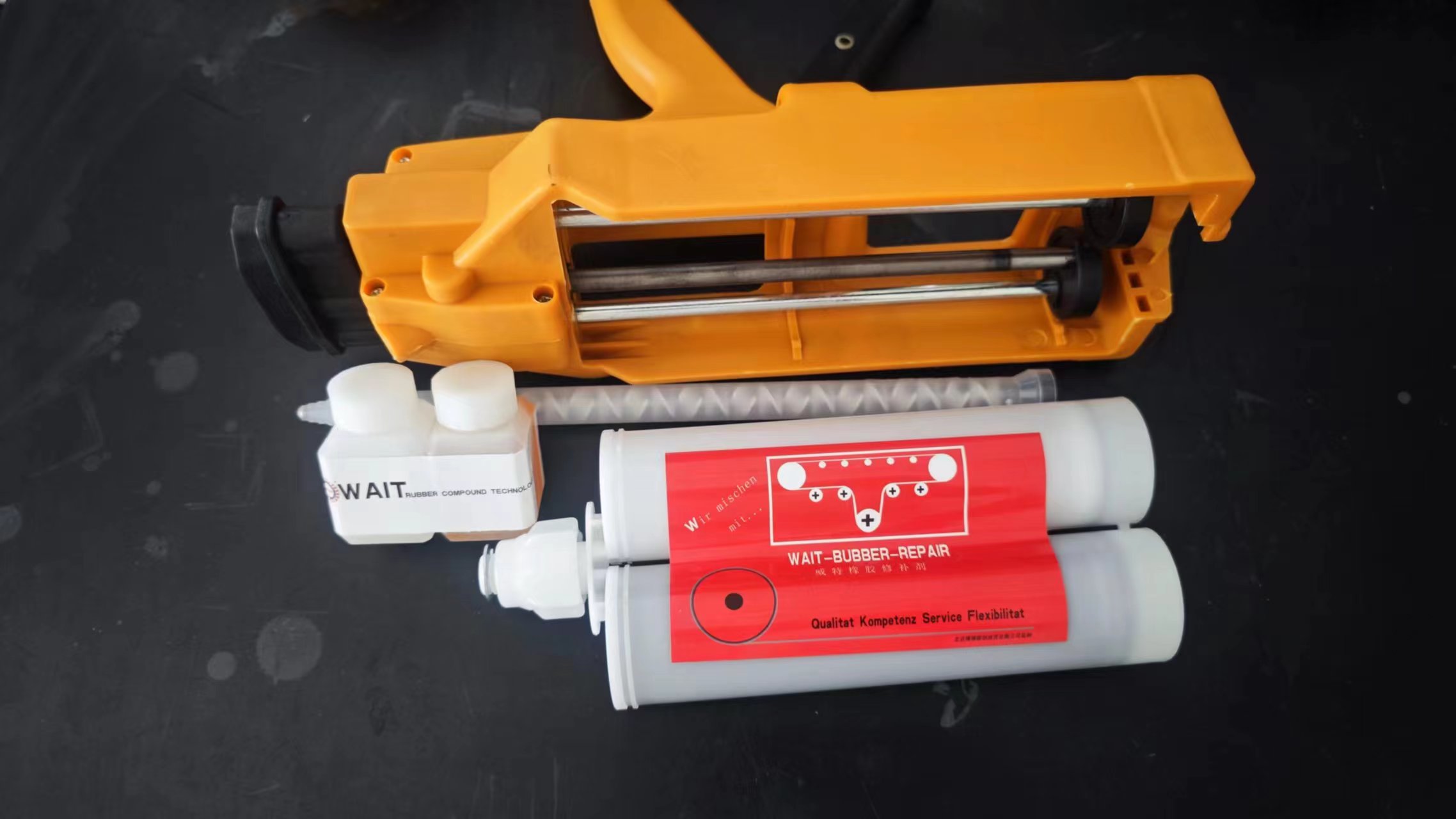 威特高强度高粘接橡胶修补剂为四组份材料,基料与固化剂AB组份混合均匀后,快速反应实现交联快速固化,粘接底胶AB组份混合后,形成粘接层。混合后的修补剂与混合后的粘剂底胶结合后能够与橡胶形成超强结合体,可适用于橡胶输送带、履带、辊、罐滚筒包胶密封橡胶制品破损等橡胶制品的快速修补。