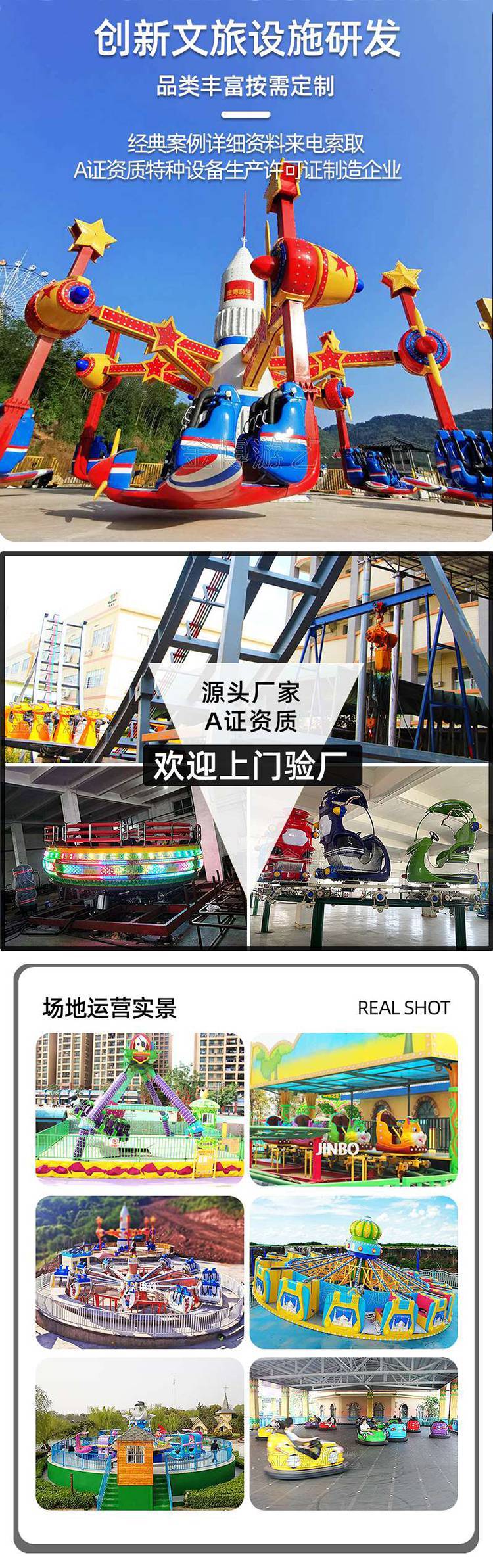 年度研发十余款新产品A证资质特种设备生产许可证企业,金博游艺设备价格公道,品质过硬,提供主题乐园一站式承建服务。大型户外游乐园设施设备供应:碰碰车,过山车,摩天轮,海盗船,大摆锤,旋转木马,小火车,自控飞机,跳楼机,高空飞翔,摇头飞椅等。