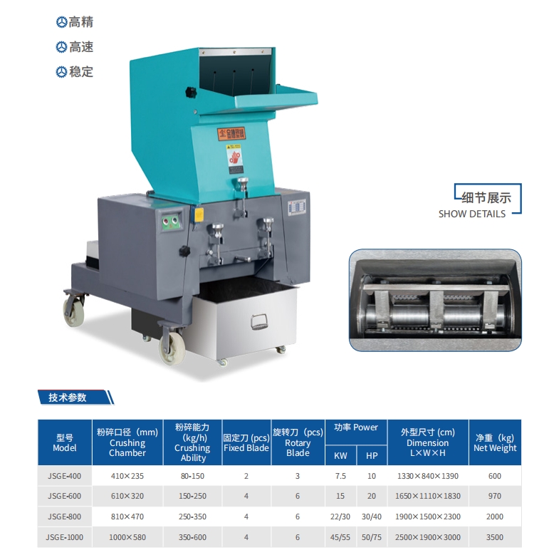 塑料破碎机对于箱类、薄管件、吹塑件、瓶、壳等塑料的回收。塑料粉碎机操作方便,换刀片简便快捷,平型刀宽大的结构适合破碎大体积薄壁、薄料产品,提高破碎效率;设有电控安全设计,料斗采用双层结构,内填隔音材料,马达附有超负荷保护装置、电源设备具有良好的安全性及环保,省电耐用,经济节能
