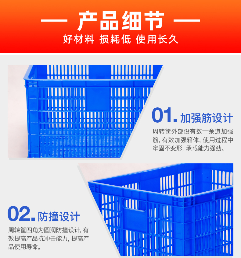 产品特点:1.承重更强:塑料周转筐筐面凹凸设计,筐底加强,外部设有加强筋,提升产品稳定性。2.整体加固:塑料周转筐外部设有加强筋,使整体更加坚固,不易变形,使用寿命更长。3.底部加厚:塑料周转筐加厚底部,配有加强筋,不仅载重增加,还具有防滑鞋。4.舒适把手:塑料周转筐把手设计圆润,光滑,使用更方便,用料更厚实。5.叠放设计:塑料周转筐可以层层叠放,更加程度的节省空间。6.防撞设计:塑料周转筐底部设有防撞边角,能有效阻止撞击,增加稳定性。