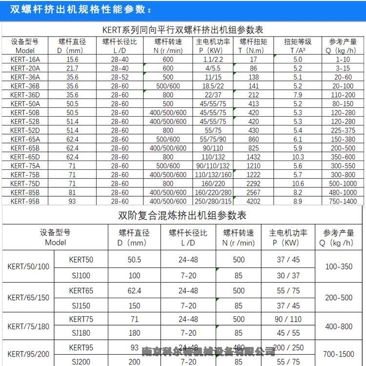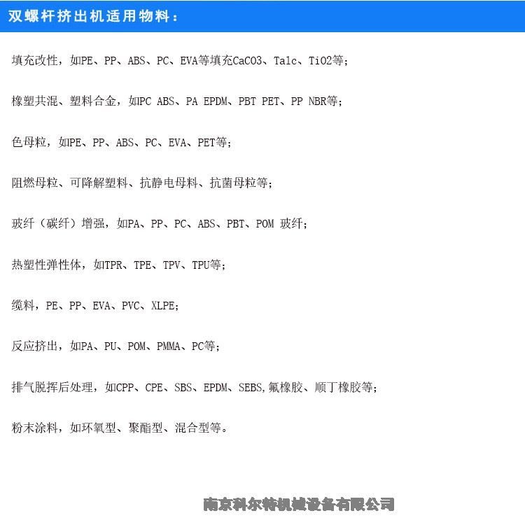 20双螺杆小型实验机, 30双螺杆挤出造粒机,36双螺杆挤出造粒机,35双螺杆挤出造粒机,50双螺杆挤出造粒机,52双螺杆挤出造粒机,65双螺杆挤出造粒机,75双螺杆挤出造粒机,85双螺杆挤出造粒机,95双螺杆挤出造粒机,120机双螺杆造粒机,135双螺杆挤出机