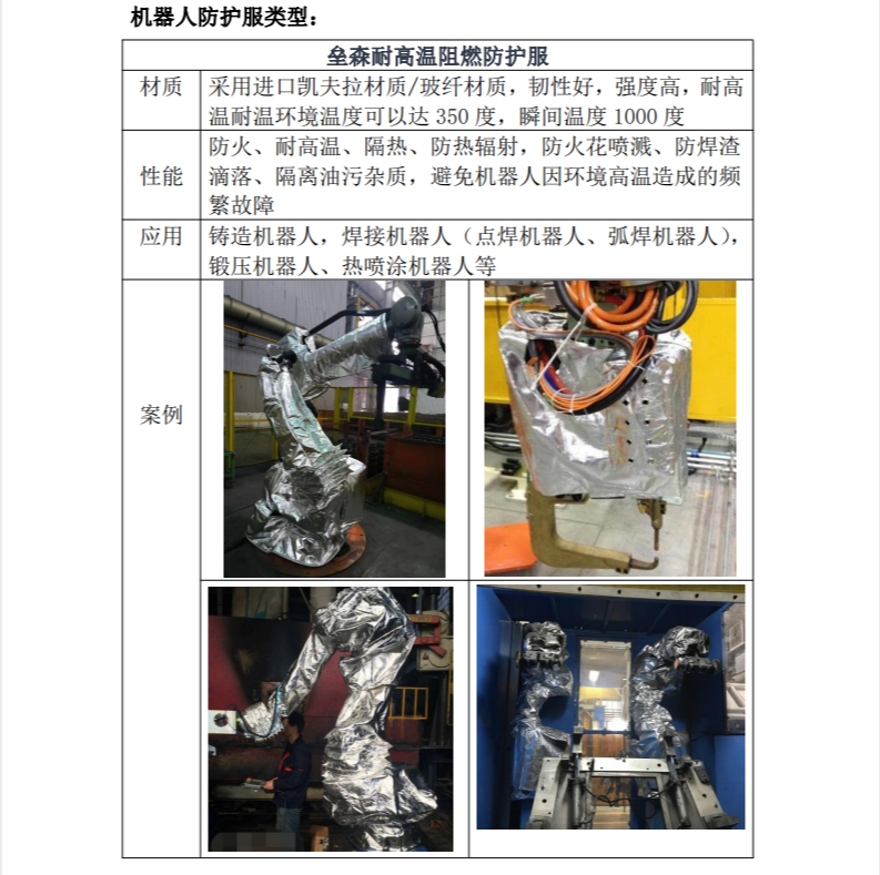 工业机器人防护:发那科机器人,库卡机器人,安川机器人,埃斯顿机器人,伯朗特机器人,ABB机器人,川崎机器人均适用;主要用于机器人喷涂防护服防尘防水阻燃耐高温喷涂