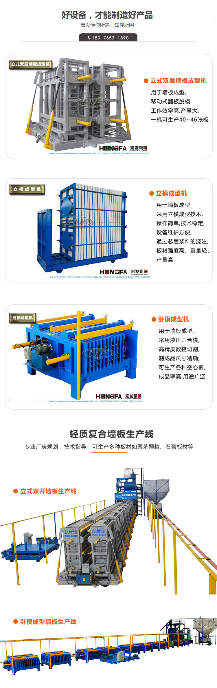 宏发轻质复合墙板生产线由可编程控制的机电液压一体化专用液压成型机,随机配各种规格的模具,生产轻质复合墙板。基于轻质高强、保温隔热、隔声防火等性能的综合要求,以目前具有轻质高强、稳定性好的无石棉纤维水泥板为外部结构面板,以取苯乙烯颗粒轻混凝土为芯材的节能环保新型实心轻质复合墙板。通过系统深入的研究,进一步优化条型墙的复合结构和拼接构造、面板和芯材的配比以及制备工艺参数,提高复合条型墙板的力学、热工、隔声、防火和耐久性能。是具有发展前景的新型墙体材料。