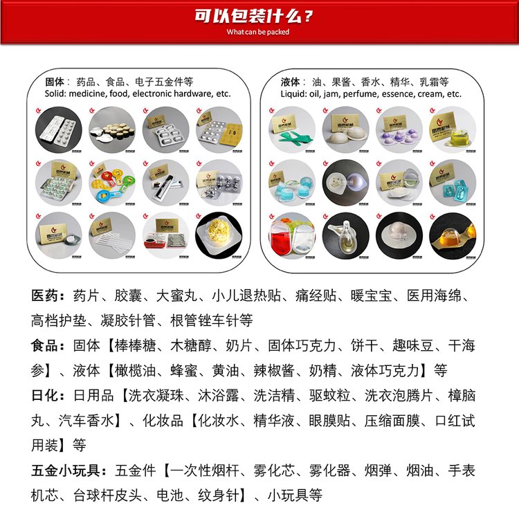 功能 | 铝塑成型-填充-封口密封包装自动化 | ||