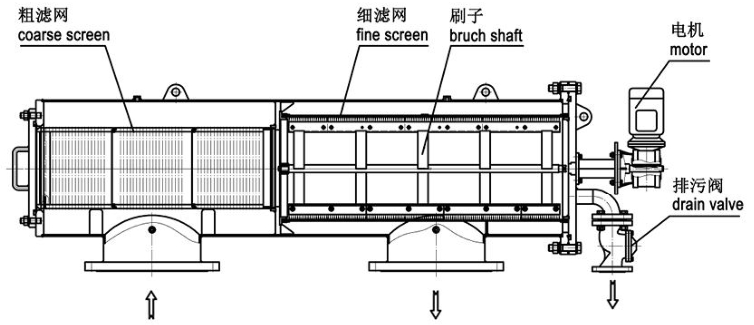 污水由设备的入水口进入过滤器内,粗滤网先对污水中的体积较大的杂质进行拦截,防止这些杂质进入机体内部后损坏机体内的部件。粗滤后的水流向机体另一端的细滤网,细滤网对水中的杂质及污物进行最后的拦截。因为污垢对滤网的堵塞,使滤网内部和滤网外部生压力差,当这个压力差达到压差开关的设定数值时,电控箱发出清洗、排污信号,控制机体上的排污阀与清扫电机同时打开。电机转动带动机体内的不锈钢刷对滤网上的污垢进行清理,再通过排污口排出污水,完成一次自清洗过程。该过滤器同时安装有定时控制器,可在一定时间间隔内定时排污。