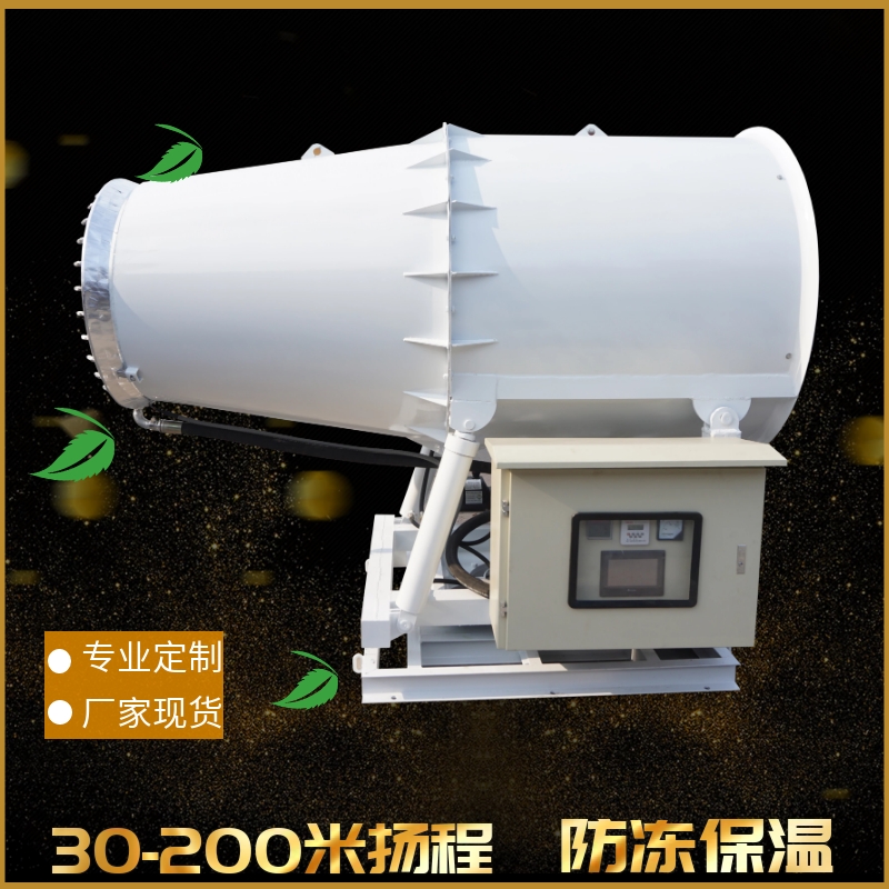 远程除尘喷雾机是由风筒、风机、俯仰机构、回转机构、喷嘴总成、供水系统、电气及控制系统、底座等组成。此外,为保证设备冬季正常使用,特选用伴热保温材料及排水装置,实现冬季降尘;远程喷雾机抗风力影响能力较强,