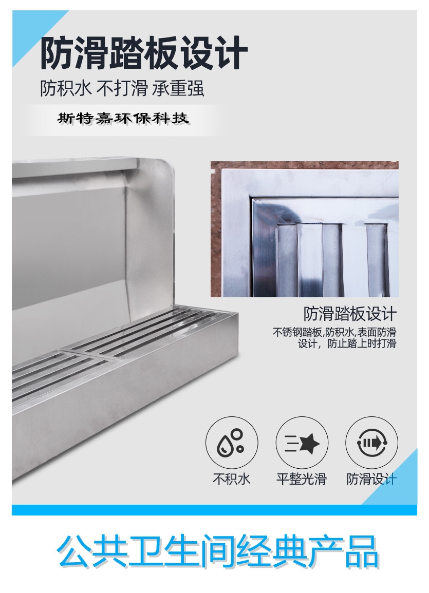 按使用者位置实现分区自动冲水,冲水形状如水晶幕帘,不飞溅,节水显著,冲刷效果好。自动冲水不锈便池无任何藏污纳垢之处,抗腐蚀,耐酸碱,易清洁,便维护,始终光亮如新。自动冲水不锈钢便池的置使卫生环境更加美观,明亮,宽敞,洁净。