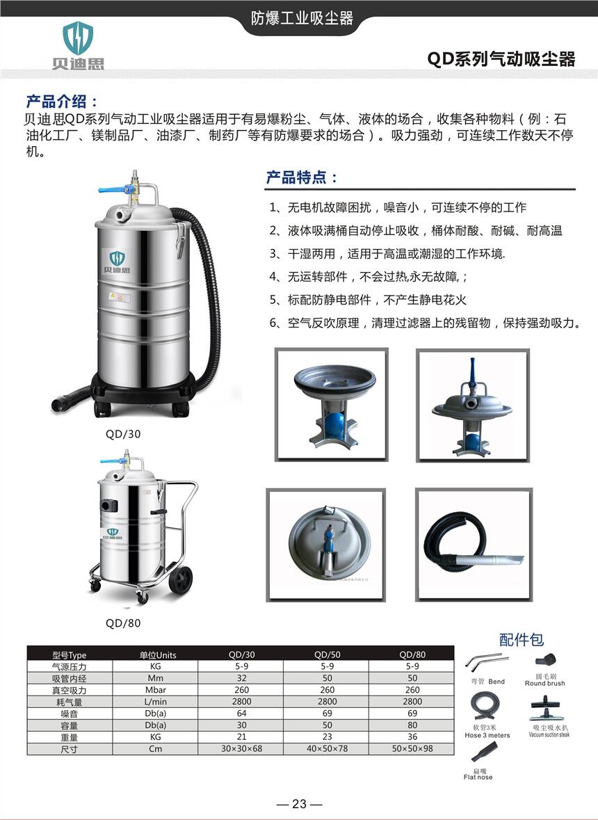 贝迪思QD系列气动工业吸尘器适用于有易爆粉尘、气体、液体的场合,收集各种物料(例:石油化工厂、镁制品厂、油漆厂、制药厂等有防爆要求的场合)。吸力强劲,可连续工作数天不停机.
