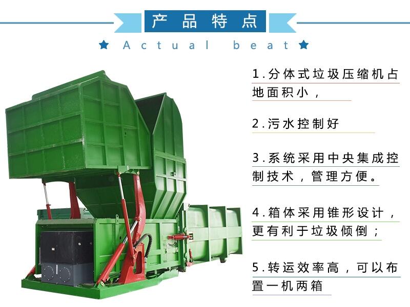 分体式垃圾中转设备包括压缩头及压缩腔、闸门升降结构、垃圾压缩机液压锁紧装置、上料斗、举升机构、移箱机构、液压系统、电气控制系统等组成。