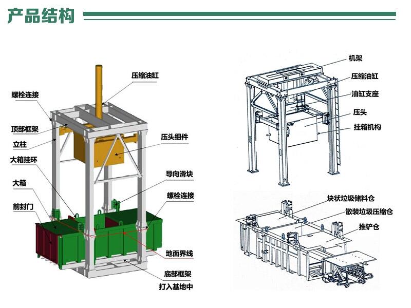 垂直式垃圾压缩站是液压系统集中在一个箱柜内,美观大方,兼顾了管道安装;电气操作台单独设置,便于观察了望和集中操作,同时方便维修;压缩站主要由压缩机、液压系统、电气控制操作系统、排污系统、喷雾冲洗除臭系统等组成。