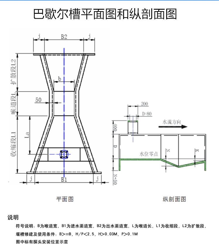 1. 巴歇尔槽的尺寸与渠道安装有关,请用户根据现场情况而定。