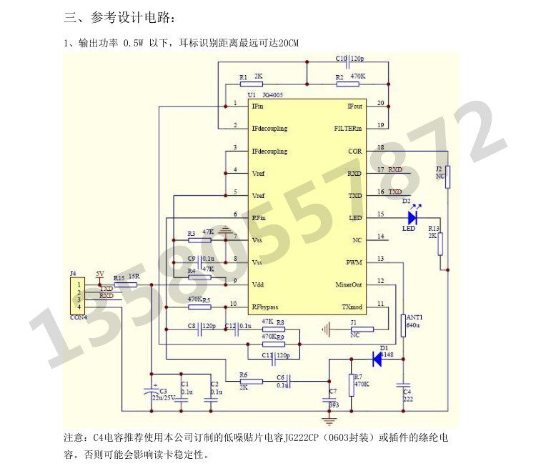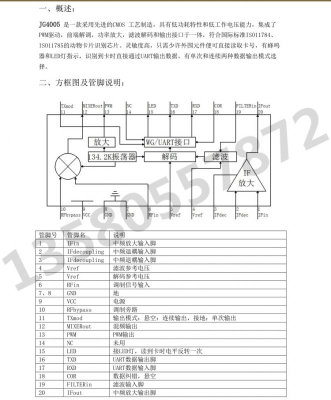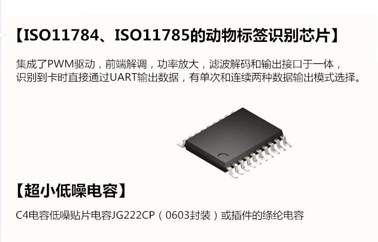 jg4005是一款采用先进的cmos工艺制造,具有低功耗特性和低工作电压能力,集成了pwm驱动,前端解调,功率放大,滤波解码和输出接口于一体,符合国际标准iso11784、iso11785的动物卡片识别芯片。灵敏度高,只需少许外围元件便可直接读取卡号,有蜂鸣器和led灯指示,识别到卡时直接通过uart输出数据,有单次和连续两种数据输出模式选择。