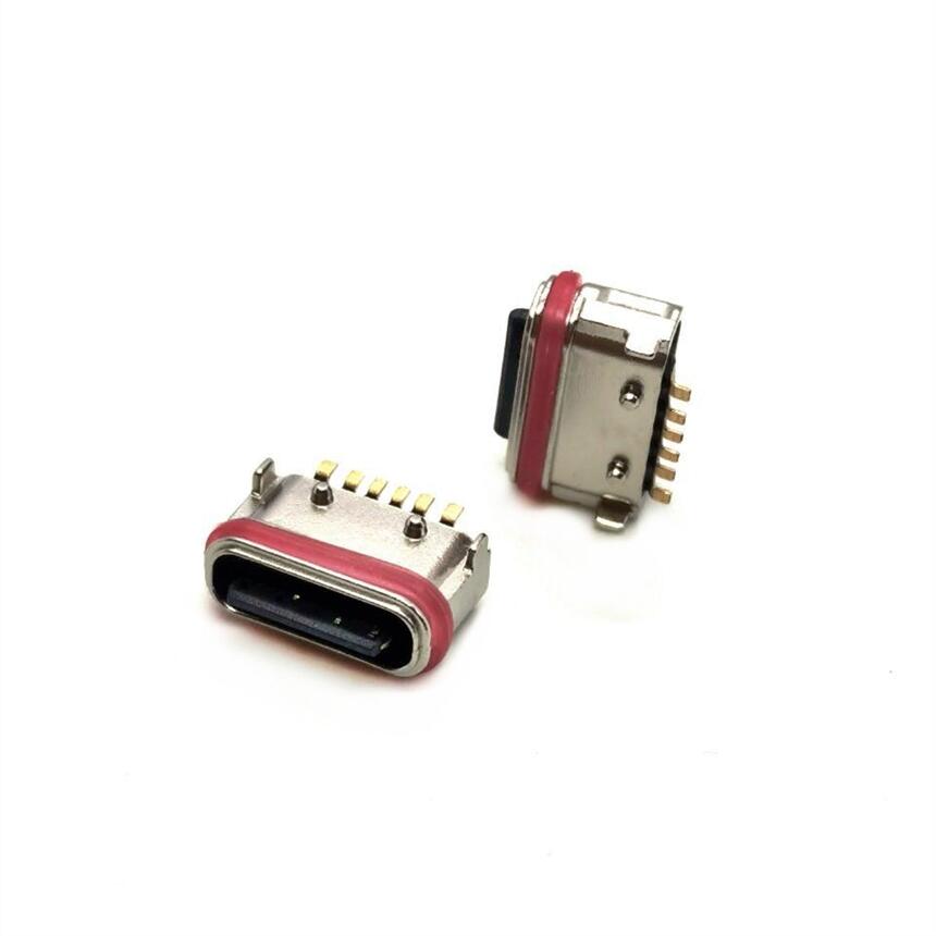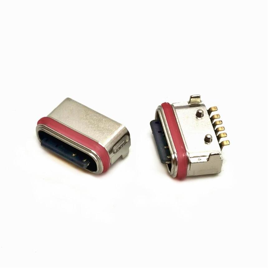 TYPE-C 6PIN板上型防水母座 后两脚带柱 粉末冶金 IPX7 外露胶芯