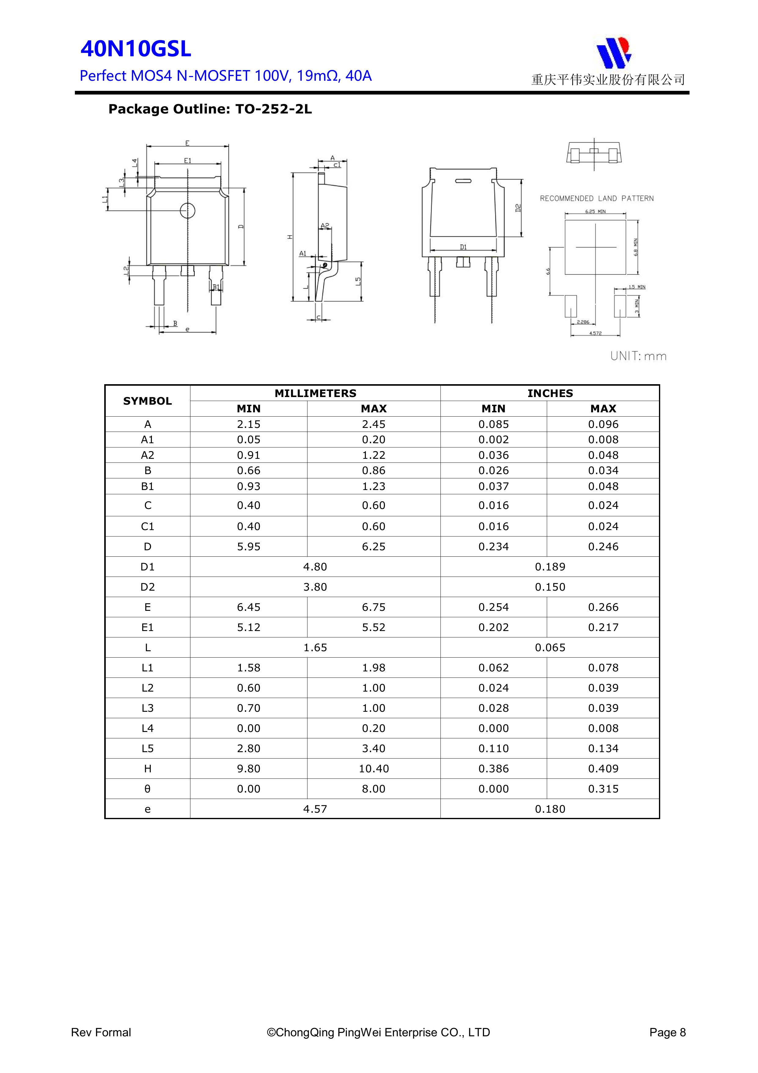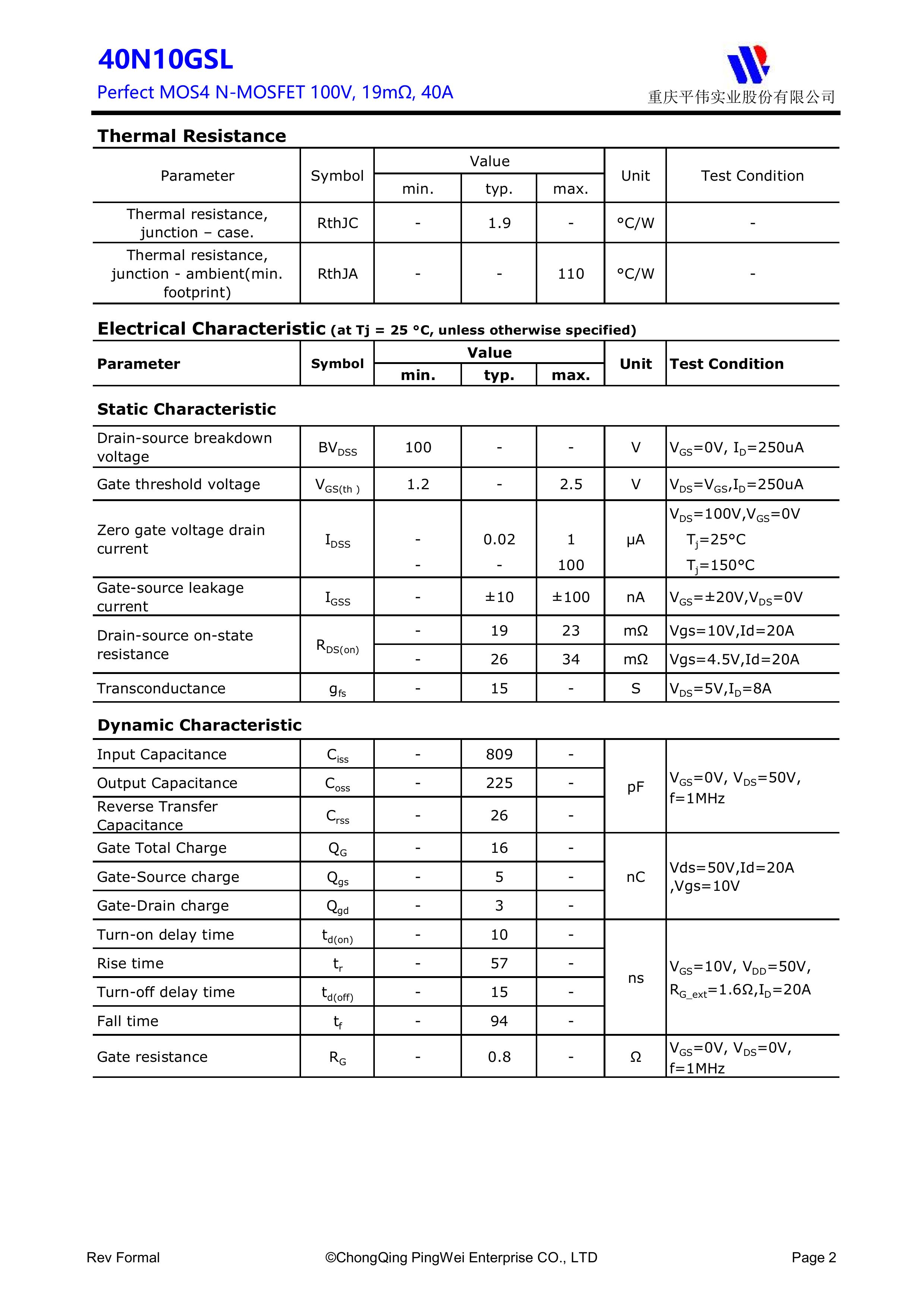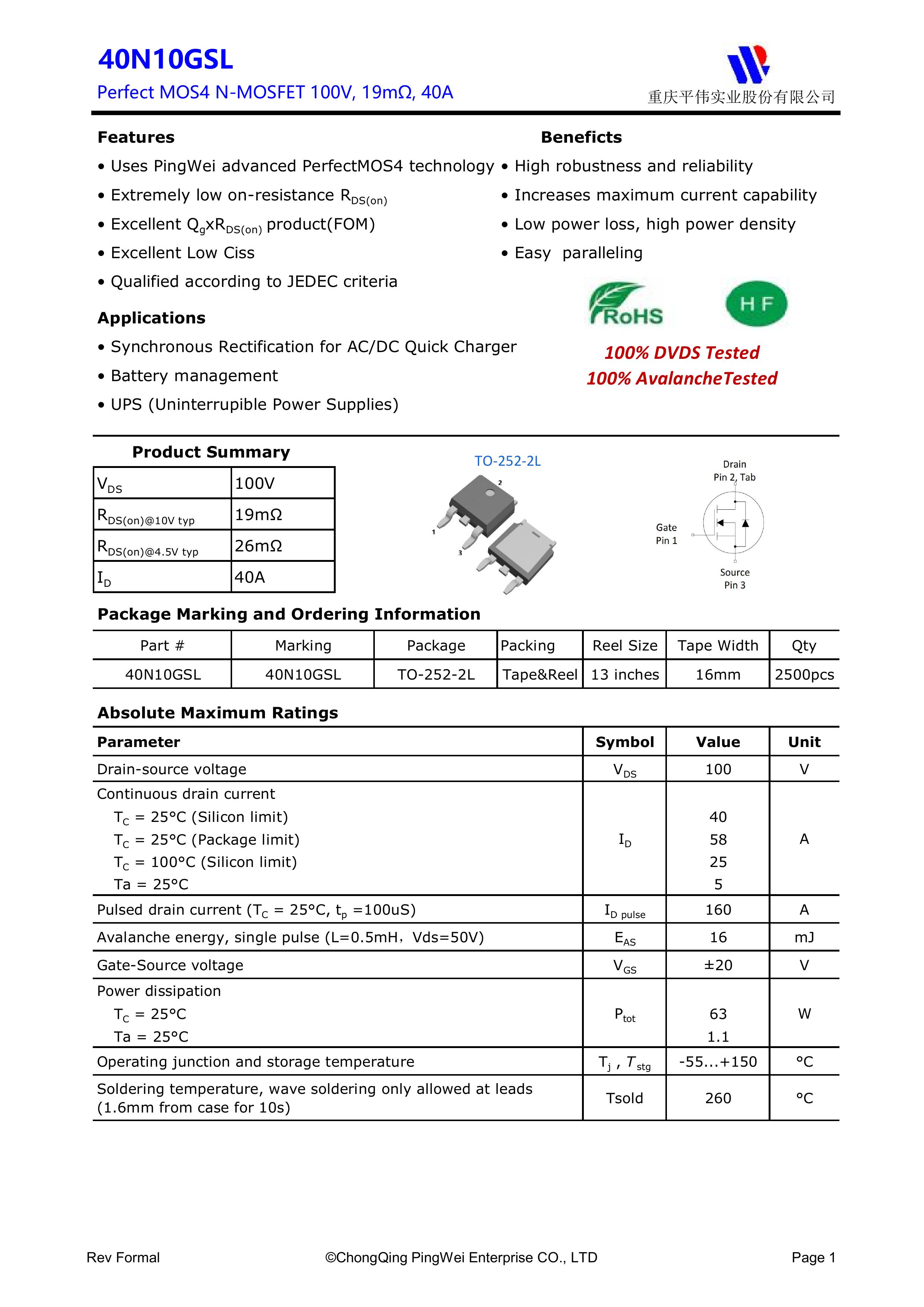 "页面标价非成交价,请联系详询报价” PY/重庆平伟实业 全新原厂原装中低压高频功率控制电子开关管 N型沟道场效应管100V、40A、19mΩ、N-Channel、贴片式中低压MOSFET:40N10GSL;电压Vds:100V;电流Id:40A;内阻Rds(on):19mΩ;封装方式:TO-252-2L;最小包装数量:2500pcs/盘-编带。