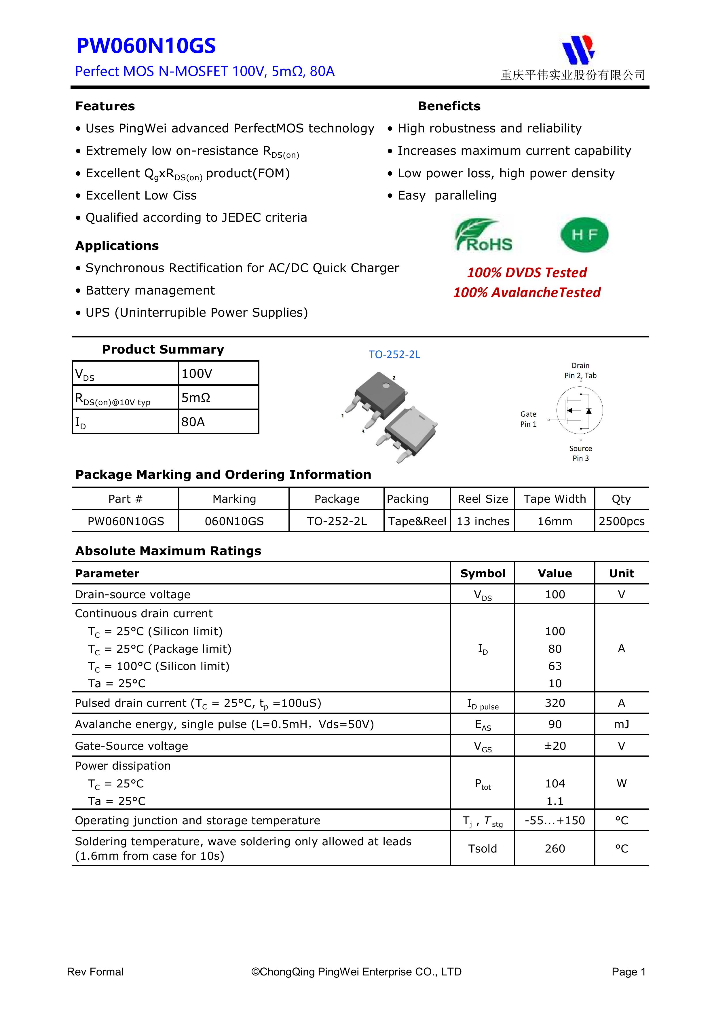 "页面标价非成交价,请联系详询报价” PY/重庆平伟实业 全新原厂原装中低压高频功率控制电子开关管 N型沟道场效应管100V、80A、5mΩ、N-Channel、贴片式中低压MOSFET:PW060N10GS;电压Vds:100V;电流Id:80A;内阻Rds(on):5mΩ;封装方式:TO-252-2L;最小包装数量:2500pcs/盘-编带。