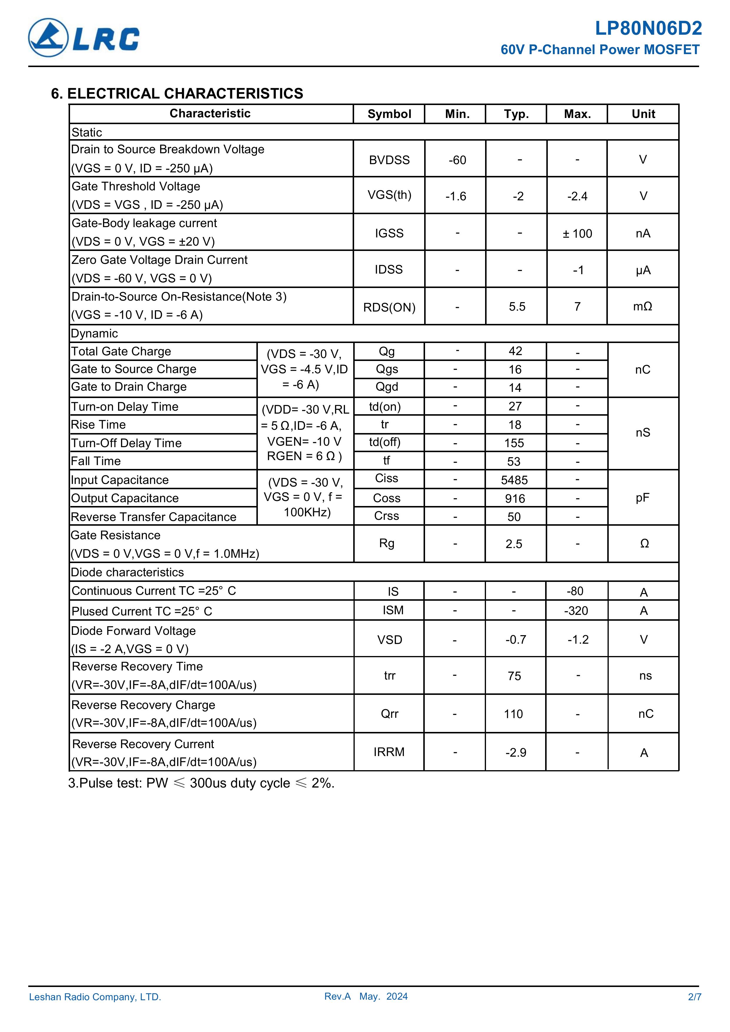 LRC/乐山无线电 LP80N06D2 全新原厂原装中低压高频功率控制电子开关管,P型沟道场效应管-60V、-59A、9.8mΩ、P-Channel、贴片式中低压MOSFET:LP80N06D2/P80N06D2。Vds电压:-60V;Id电流:-59A;Rds(on)内阻:9.8mΩ;封装方式:TO-252-2L;最小包装数量:2500pcs/盘-编带。