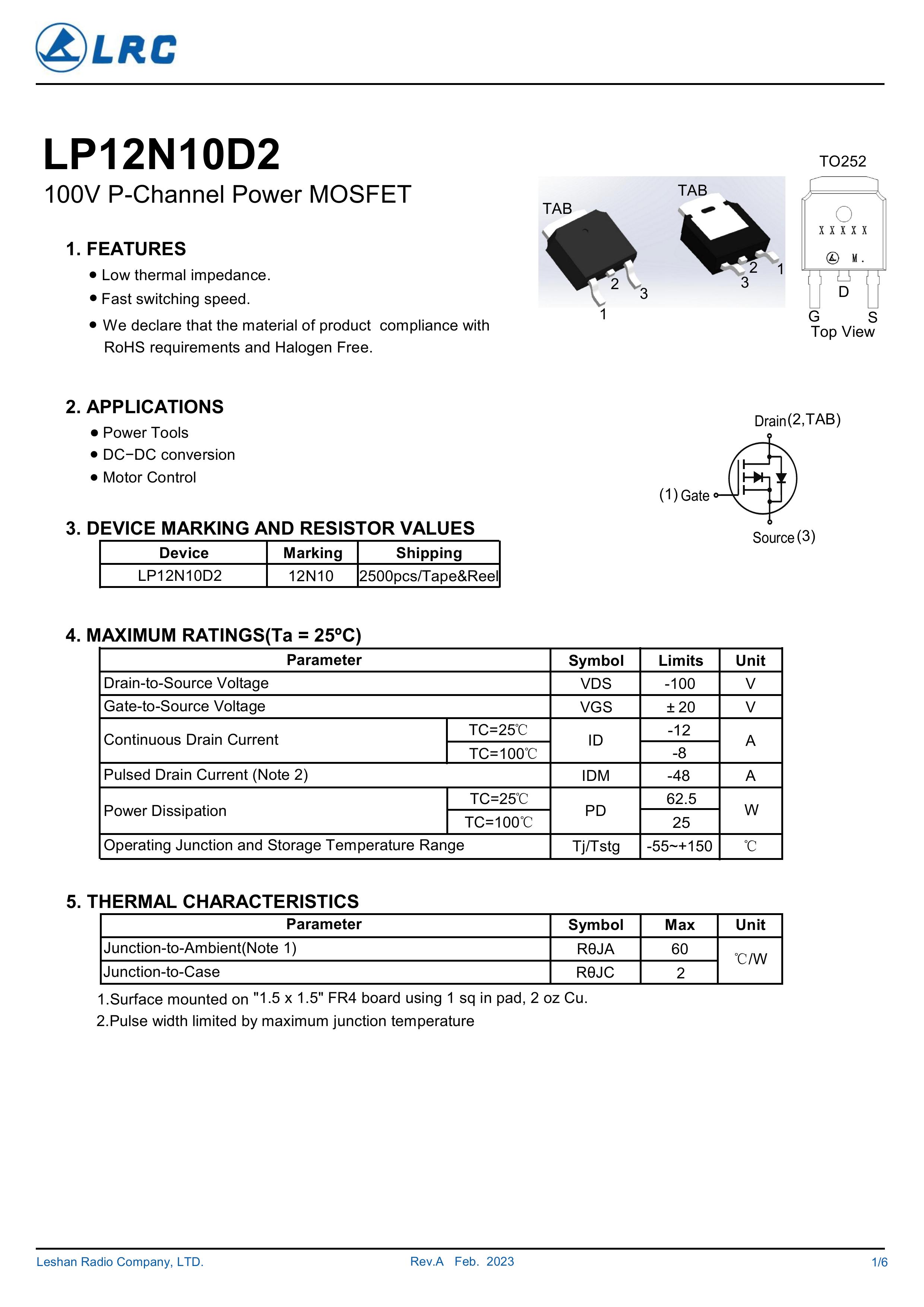 LRC/乐山无线电 LP12N10D2 全新原厂原装中低压高频功率控制电子开关管,P型沟道场效应管-100V、-12A、270mΩ、P-Channel、贴片式中低压MOSFET:LP12N10D2/12N10。Vds电压:-100V;Id电流:-12A;Rds(on)内阻:270mΩ;封装方式:TO-252-2L;最小包装数量:2500pcs/盘-编带。