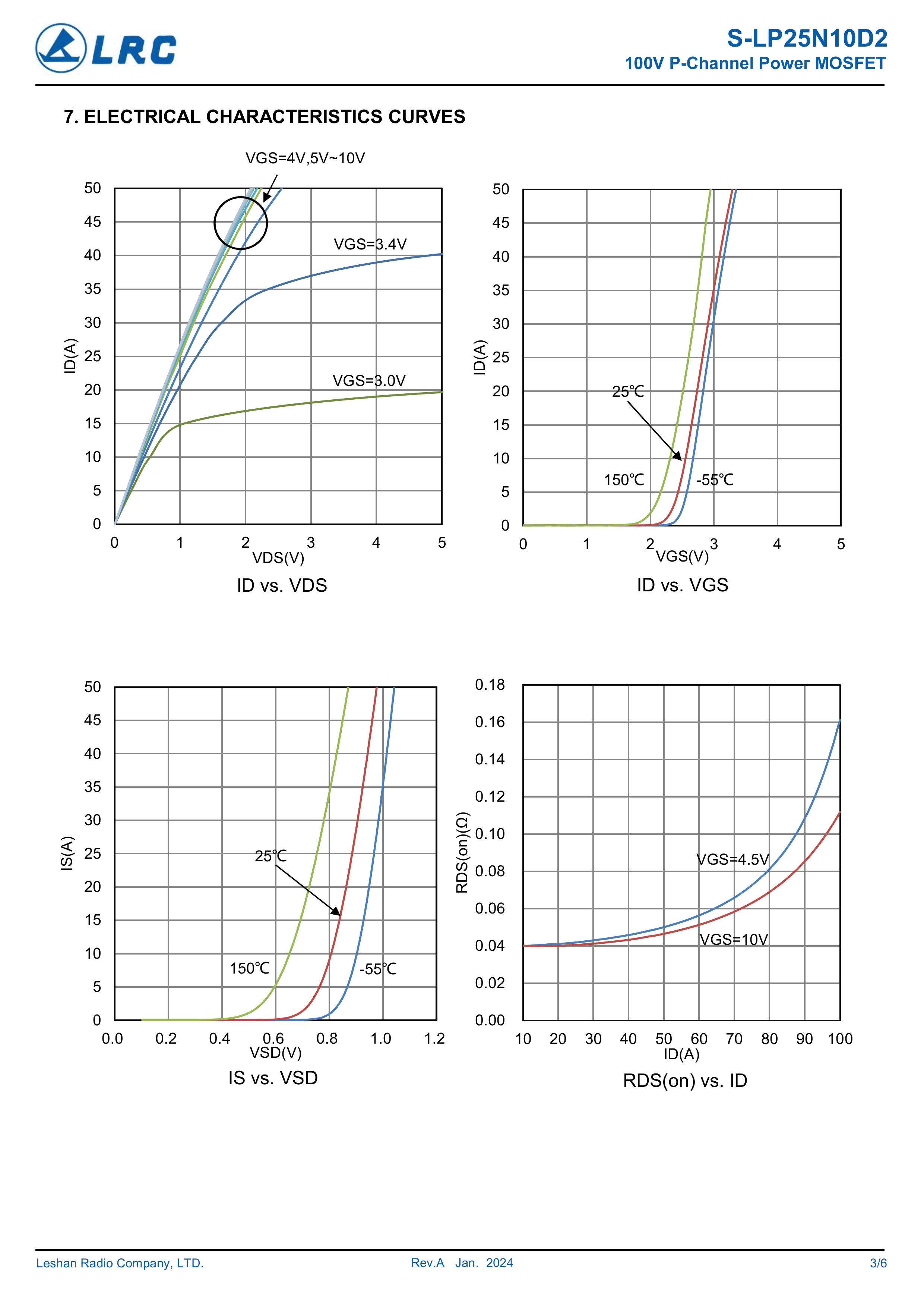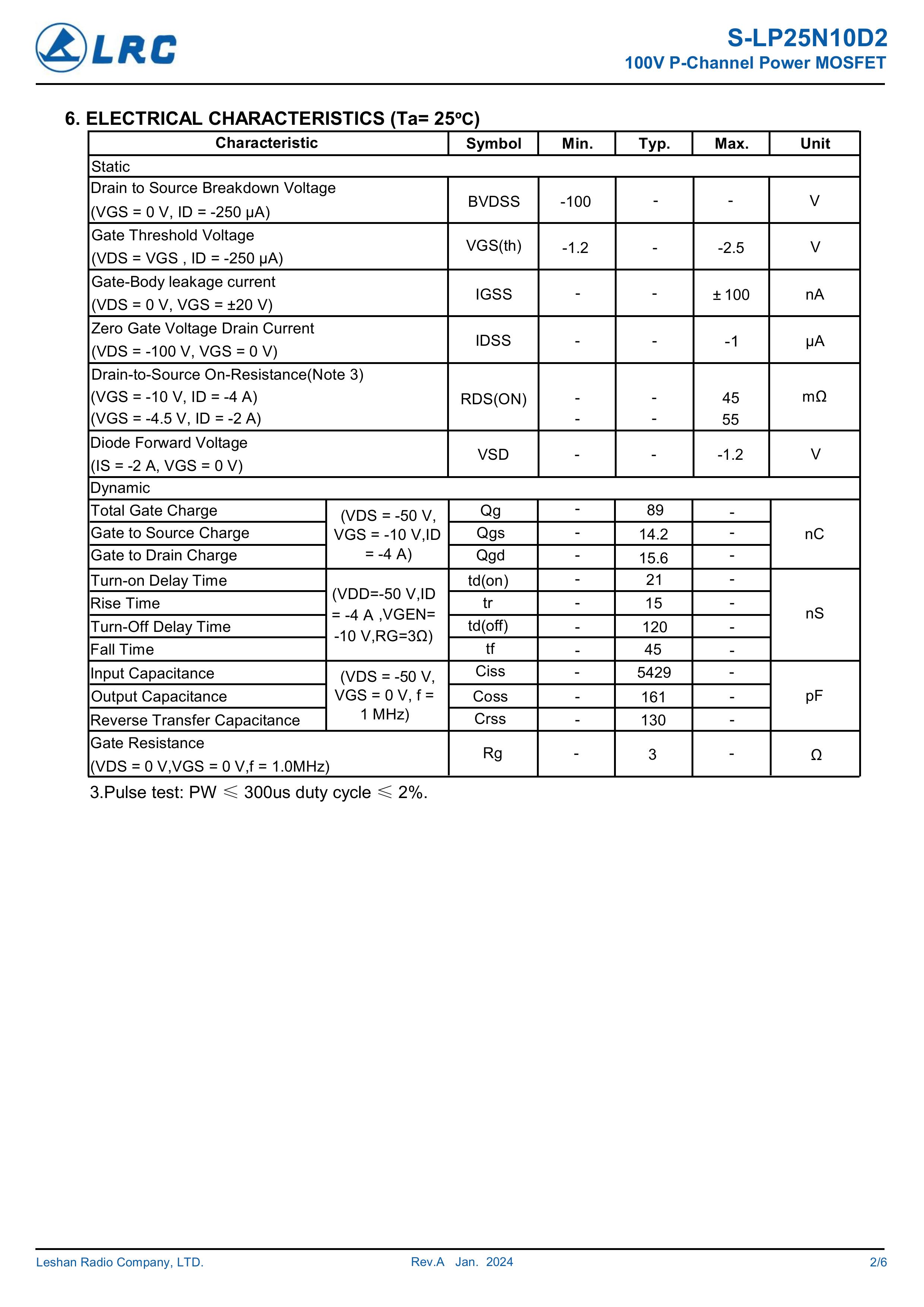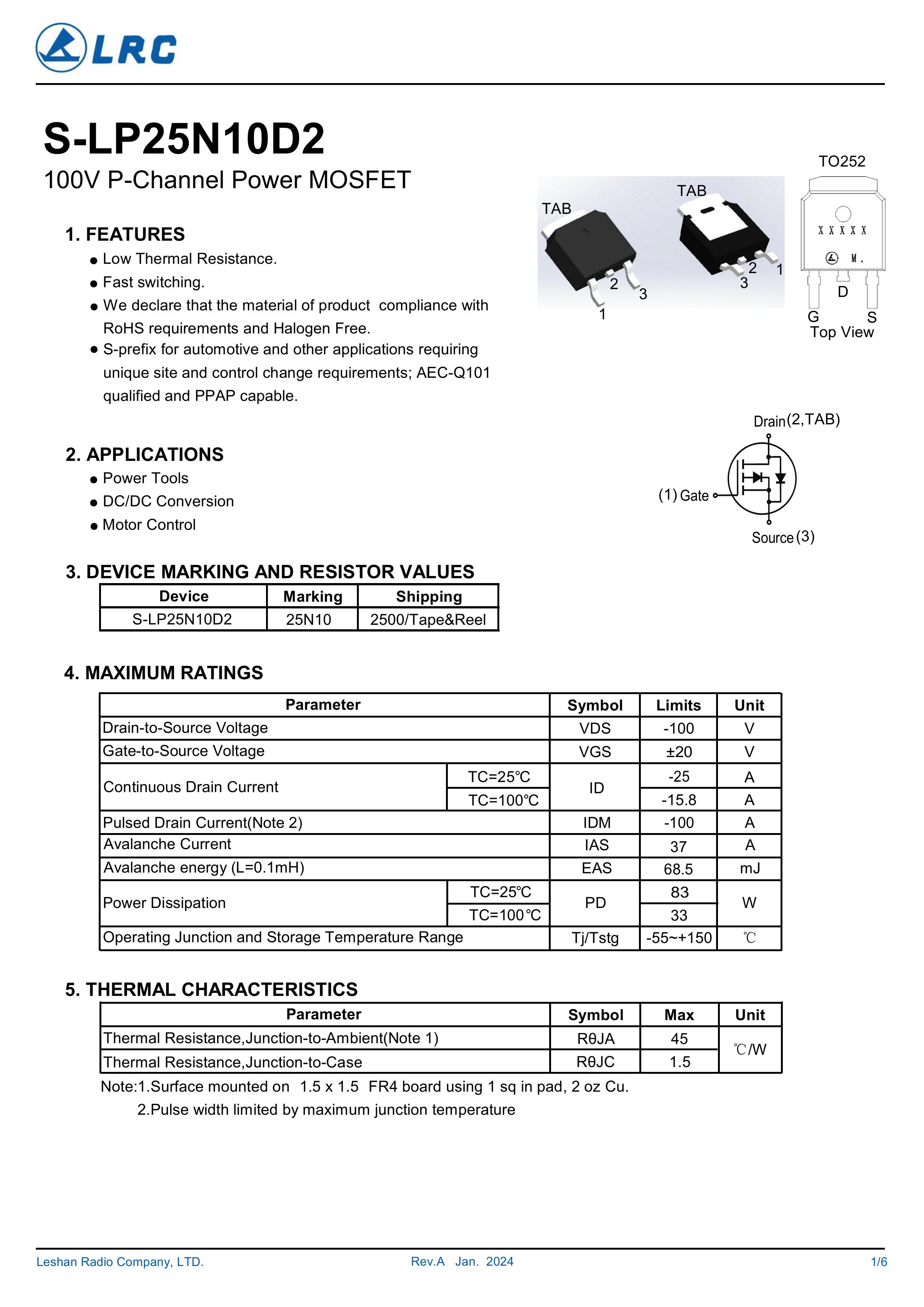 LRC/乐山无线电 S-LP25N10D2 全新原厂原装中低压高频功率控制电子开关管,车规级P型沟道场效应管-100V、-25A、45mΩ、P-Channel、贴片式中低压MOSFET:S-LP25N10D2/25N10。Vds电压:-100V;Id电流:-25A;Rds(on)内阻:45mΩ;封装方式:TO-252-2L;最小包装数量:2500pcs/盘-编带。