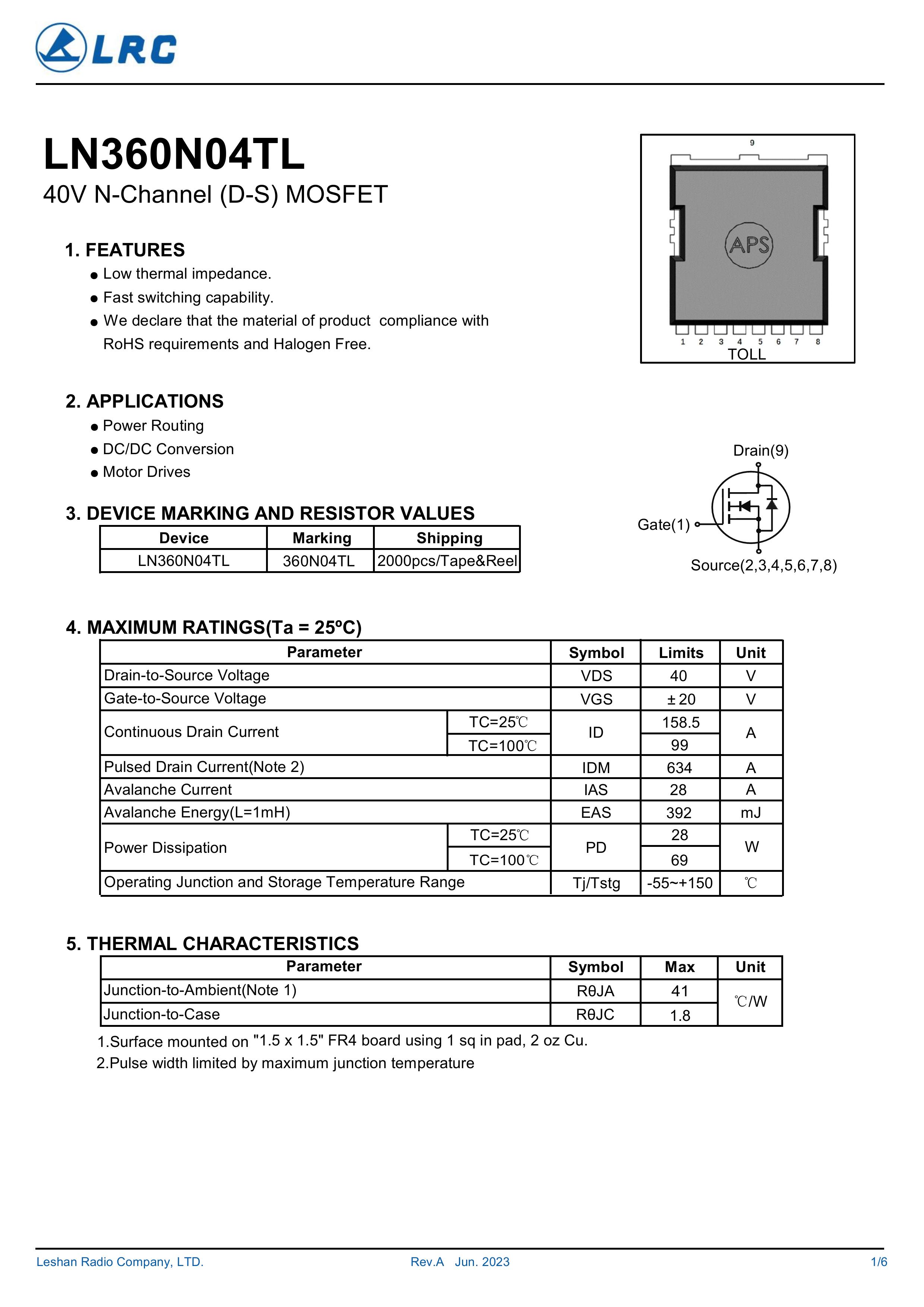 LN360N04TL/360N04TL 大芯片中低电压大电流低内阻低漏电的分立式功率整流晶体开关管。本品采用内置大尺寸芯片,源极7脚位支持多路输出贴片式封装,,具有适应中低电压低内阻损耗高频高效恢复快等电气特性特点。通用于电源、小家电、锂电池、马达电机、电动工具、无人机、电器、适配器、充电器、逆变器、充电桩、特种电源、高频电源、风光储新能源、医疗设备、工业工控等产品电路作电子开关、控制、整流、放大、钳位、防反接、防逆回流等作用。