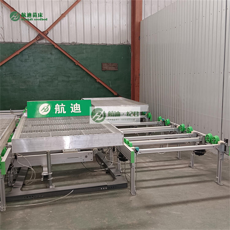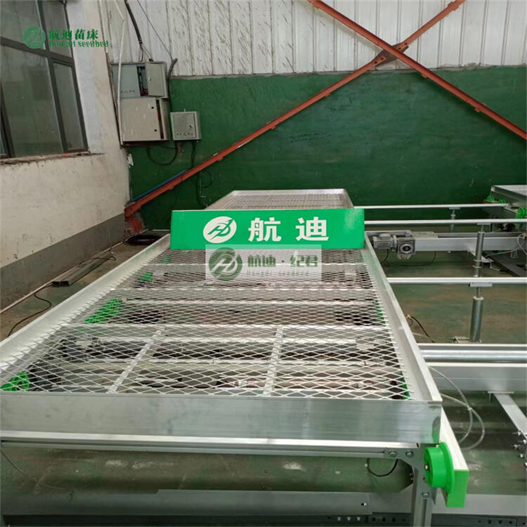 物流式苗床,也叫全自动苗床,它的出现使农业的生产设备达到了高峰,物流式苗床为了实现对温室中的盆栽植物进行运输,盆栽植物被放置在铝合金苗床内。苗床由两个铝合金侧板、两个铝合金隔板、底部横撑以及一个底盘组成。苗床的底部有四组滚轮,苗床可以在导轨上移动。苗床可以在苗床导轨上做横向移动,温室两端留出的通道,配置苗床纵向转移装置,通过气动装置负责苗床的纵向转移,形成了完整的苗床输送系统。无论是刚刚完成的种苗移栽,还是盆花的成品上市,均可以通过这套系统完成。
