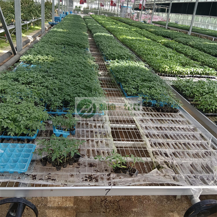 温室苗床分为固定式苗床和移动式苗床,固定式苗床为单层苗床,高度不可调整,采用热镀锌角钢或矩形管作为骨架,床面铺设钢丝网。移动式苗床采用热镀锌管材,边框采用铝合金,苗床网表面热镀锌防腐处理,高度可微调,具有防侧翻装置,且可在任意两苗床之间产生适当宽度作业通道。