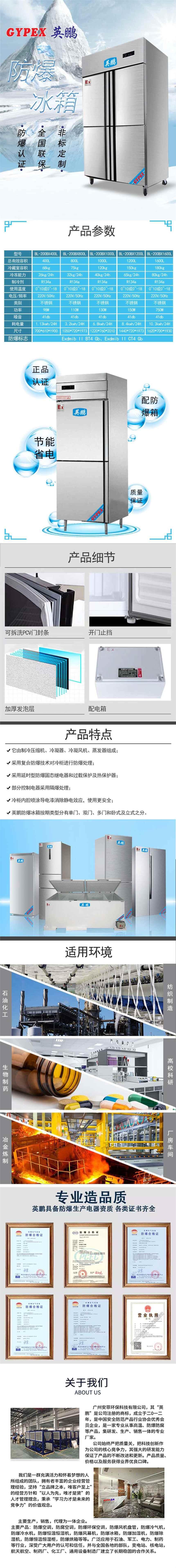 适用于石油、化学化工、医药、航空航天、实验室、储藏、军事等部门具有ⅡC级,温度组别为T4的爆炸性气体混合物的l区(或2区)内部危险性场所,BL系列工业级集成防爆冰箱,是采用集成防爆技术,按工业环境使用要求制造的ⅡC级防爆制冷系统。 采用的是电子温控系统,电子温控防爆电冰箱是继机械温控防爆电冰箱之后的第二代新产品。电子温控防爆电冰箱与机械温控防爆电冰箱的主要区别在于温度控制器及其电气线路结构的不同,其箱体构造、制冷工作原理大致与机械温控电冰箱相同,在此不再重复介绍。 电子温控不锈钢防爆电冰箱既有直冷式又有间冷式,其控制功能多种多样。除根据冷藏、冷冻室温 度控制压缩机开停外,其能自动显示冷藏、冷冻室的温度,还具有可根据霜层厚度与压缩机工作时间自动除霜,以及过电压保护、自动除臭和语言提示等功能。一般来说,电子温控比机械温控复杂。无论电子控制还是电脑控制的防爆电冰箱,都是模糊控制系统的最新应用,解决了多功能防爆电冰箱的控制问题,然而由于控制复杂也给维修者带来诸多不便。 电子温控大都采用热敏电阻式温度控制器(温度传感器),因为它的温感探头随温度升高电阻变小,随温度下降电阻变大。利用其这一特性,可以使压缩机开机与停机,从而实现电路控制。 整机采用国际领先超弱电技术隔离本质安全型电路,经特殊工艺制造和防爆处理,产品的设计、制造严格按产品严格按照国家相关标准: GB 3836.1-2000 《爆炸性气体环境用电气设备 第1部分:通用要求》 GB 3836.2-2000 《爆炸性气体环境用电气设备 第2部分:隔爆型“d”》 GB 3836.3-2000 《爆炸性气体环境用电气设备 第3部分:增安型“e”》 GB 3836.4-2000 《爆炸性气体环境用电气设备 第4部分:本质安全型“i”》 GB 3836.9-2006 《爆炸性气体环境用电气设备 第9部分:浇封型“m”》 产品表面采用最高表面温度限制保护技术和全面的防静电技术,及多种安全保护技术; 电压:220V/50Hz; 内部防爆标志:Exdmib‖CT4 。