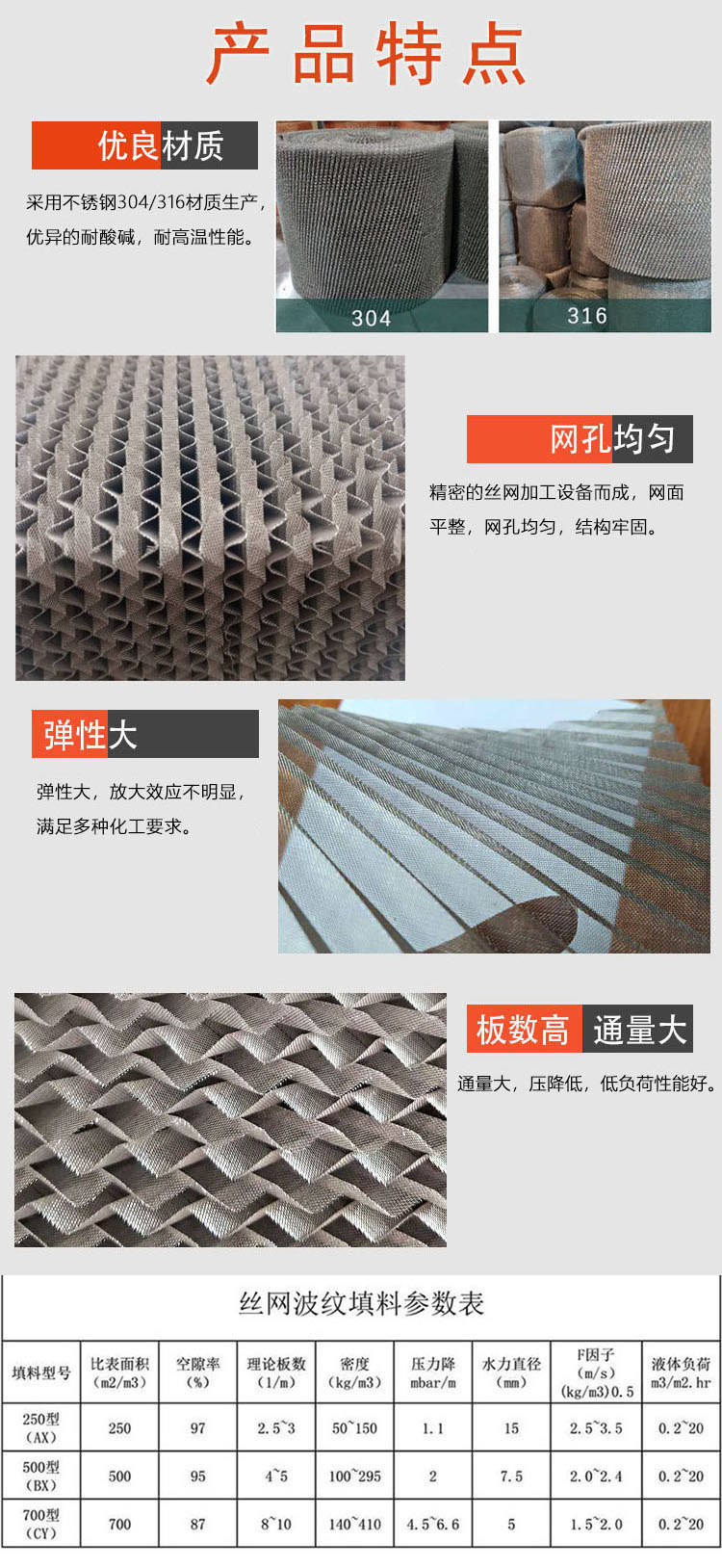 天马供应金属丝网填料 波纹规整类型 BX500/CY700型号 不锈钢材质 密度 | 20(g/cm3) | ||